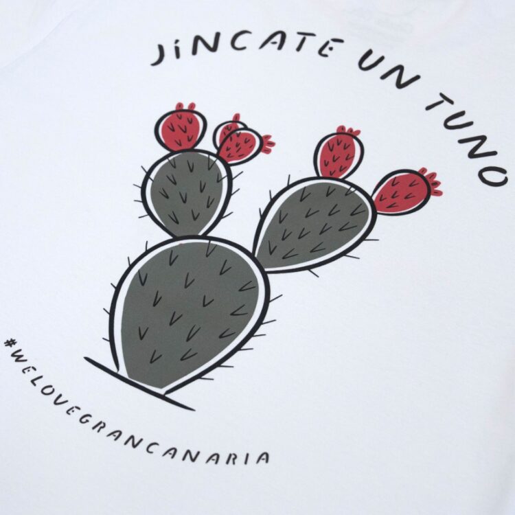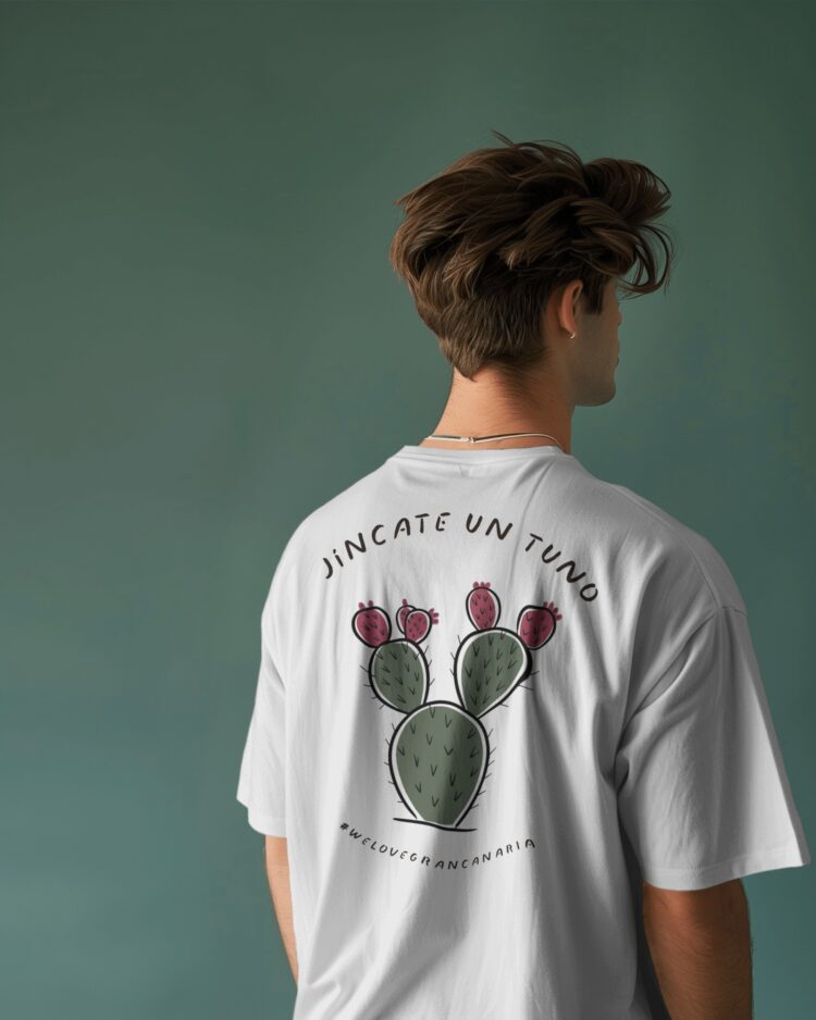 “Jíncate un tuno” no es solo una frase, es una invitación a saborear lo auténtico. Esta camiseta oversize celebra el léxico canario con una de sus expresiones más míticas, en honor al tuno —el fruto de la tunera, ese cactus tan nuestro que crece libre por la isla.
