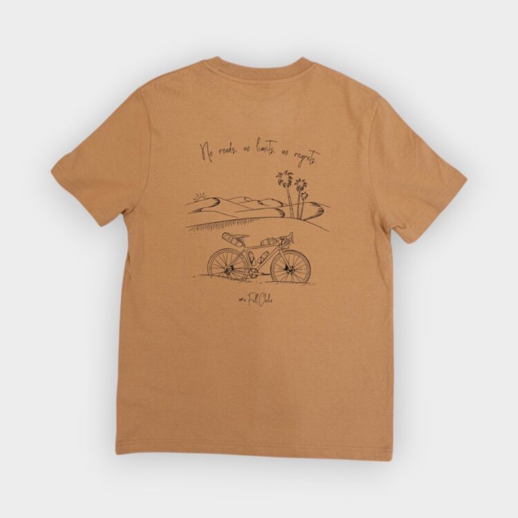 Inspirada en la experiencia de cruzar Fuerteventura en bicicleta de gravel y en autosuficiencia, esta camiseta representa esa sensación única de libertad total que solo se alcanza pedaleando por caminos de tierra, dunas y silencio. “No Roads, No Limits” no es solo un lema: es una declaración de principios para quienes viven a su ritmo y sin ataduras.