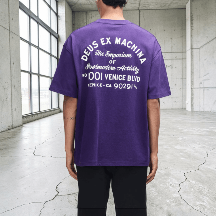 El gráfico “Venice Sign” refuerza la identidad global de Deus, conectando California con el resto de hubs creativos de la marca. La Venice Sign Tee Violet Indigo funciona como pieza protagonista del outfit, especialmente combinada con denim claro, pantalones negros o cargos estructurados.