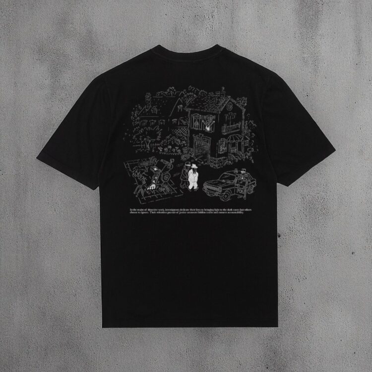 Esta versión en color negro presenta en la parte trasera una ilustración exclusiva que representa una escena del crimen con estilo gráfico y mirada artística. En el pecho, sobre el lado izquierdo, incluye el logotipo “Edmmond” con efecto bolígrafo, aportando un toque distintivo y personal. Su corte relajado y largo perfecto hacen de esta camiseta una prenda versátil y atemporal.