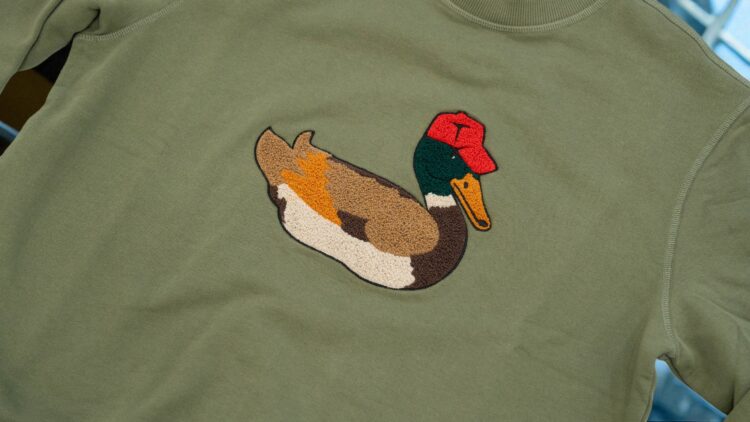 Logo bordado del pato como sello distintivo minimalista