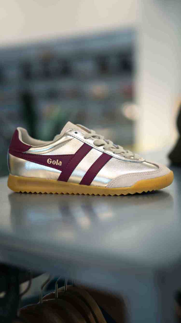 Fabricadas en material metálico dorado con el icónico logo Gola wingflash en rosa cereza y una lengüeta trasera a contraste, ofrecen un look vibrante y sofisticado. El diseño con puntera corta y cordones alargados aporta un ajuste preciso y estilizado. Una silueta única que eleva cualquier outfit urbano.