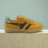Las Gola Viper vuelven directamente desde los archivos de 1976 con un diseño retro irresistible. Esta versión femenina destaca por su parte superior de ante en color sun yellow, el logo wingflash en marrón oscuro y una lengüeta en azul océano que aporta contraste y carácter. Su silueta de puntera corta y cordones de siete ojales remata con una suela de goma tipo gum sole, perfecta para un look urbano con esencia vintage. Moda sostenible en tus pies!