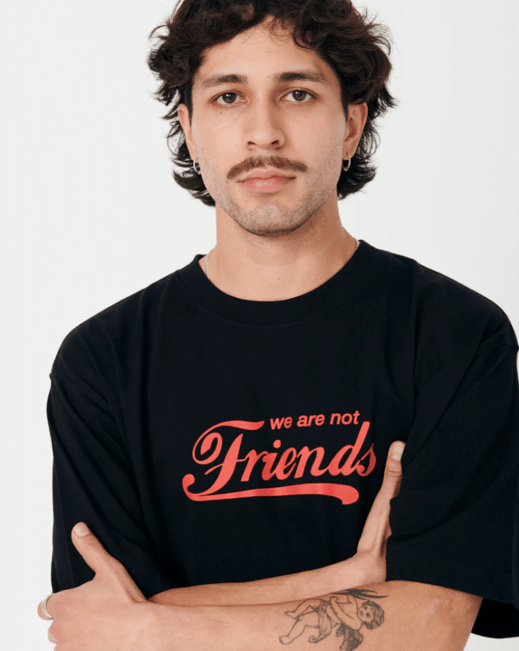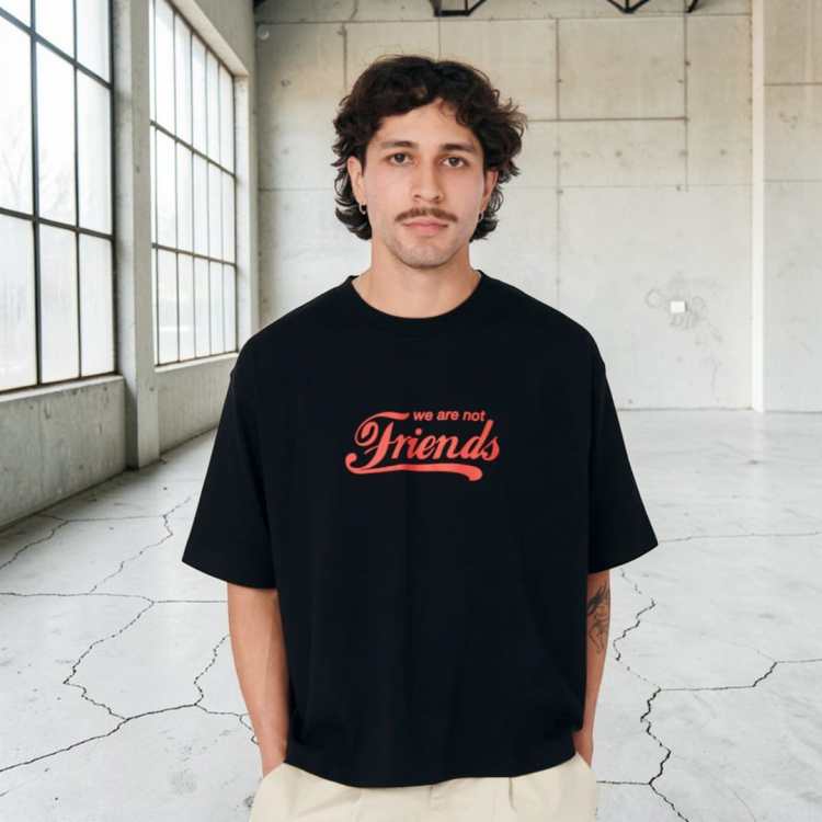 La Major Friends Boxy Tee es una de las piezas más directas de la colección Spring 26 de We Are Not Friends. El gráfico “Major Friends” conecta con esa estética de pandilla, de bloque, de cultura de barrio que recorre toda la temporada: referencias a los cartones de juguetes, los pósters de los 90 y la tipografía de calle que nunca pasó de moda. La silueta boxy oversize da amplitud y soltura, el algodón de 200 GSM con teñido en prenda garantiza una caída y un tacto superiores al básico estándar. Diseñada en Barcelona, fabricada en Portugal con certificación OEKO-TEX Standard 100.